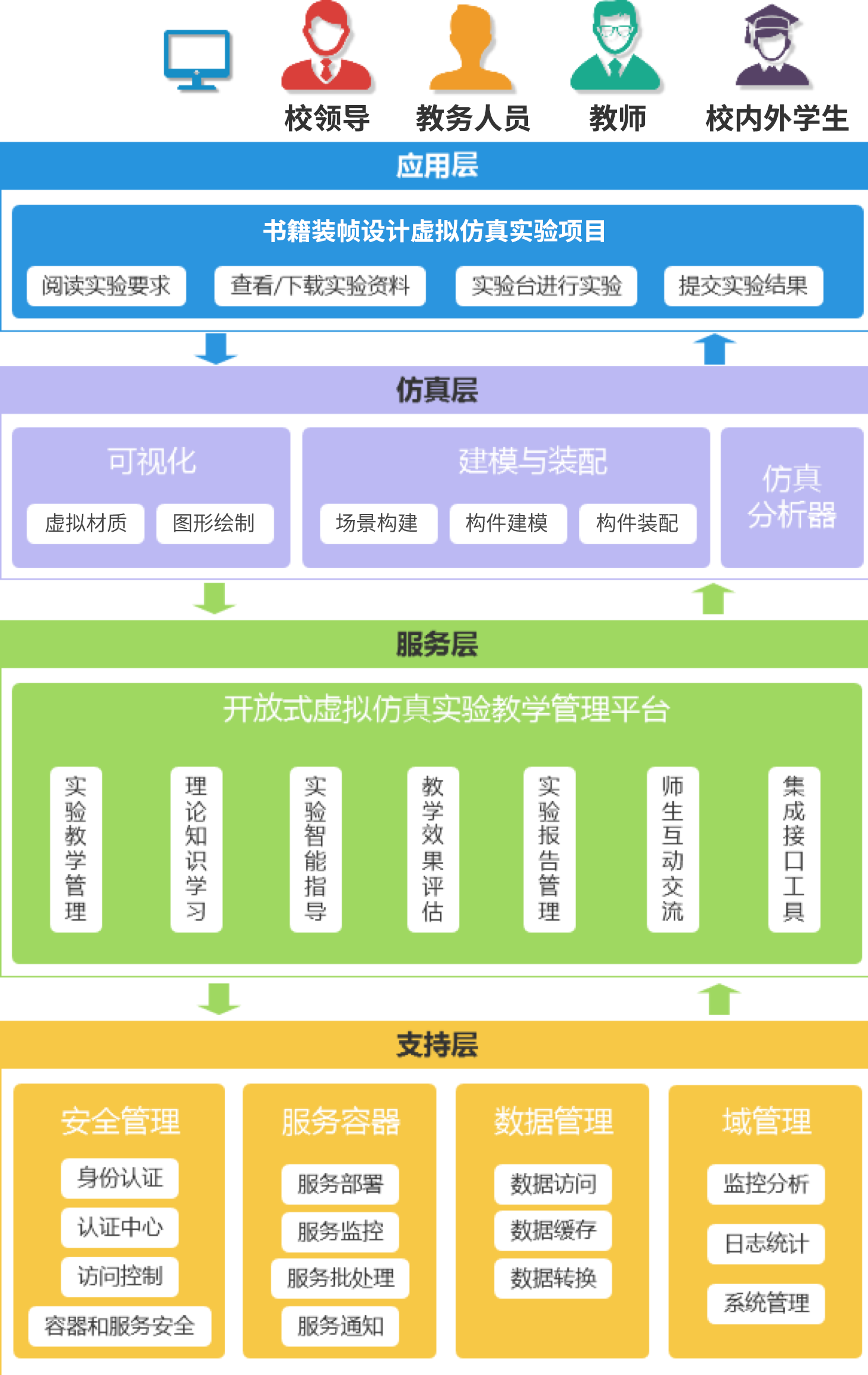 如图,系统架构分为5层,每一层为其上层提供服务,直至完成本系统构建。其中数据层完成所有过程数据及元器件数据存储;支持层完成安全、数据、系统管理;服务层完成平台实验管理,负责实验项目应用模块接入;仿真层完成虚拟实验的模拟,进行相应的材质建模及场景开发等;应用层是面向用户的交互层,具有良好的扩展性和实用性。